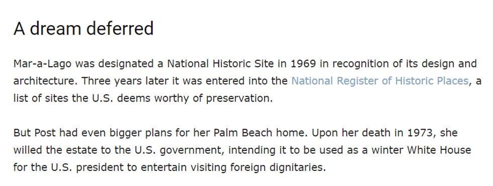 The writer had told the story of how lady socialite Marjorie Merriweather Post built Mar-a-Lago 90 years ago, and she specifically decided it should be the fanciest of houses. She had dreams for the place, that American presidents could come down there and go swimming or whatever, but fate had other plans. Look, here's a part: