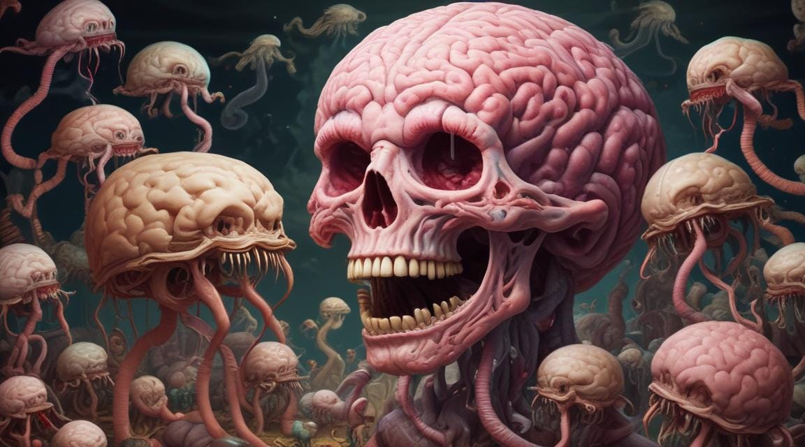 I ran “brain worms eating brains” through Substack’s built-in image generator, and it came up with nightmare fuel / ‘80s rock album covers like this.