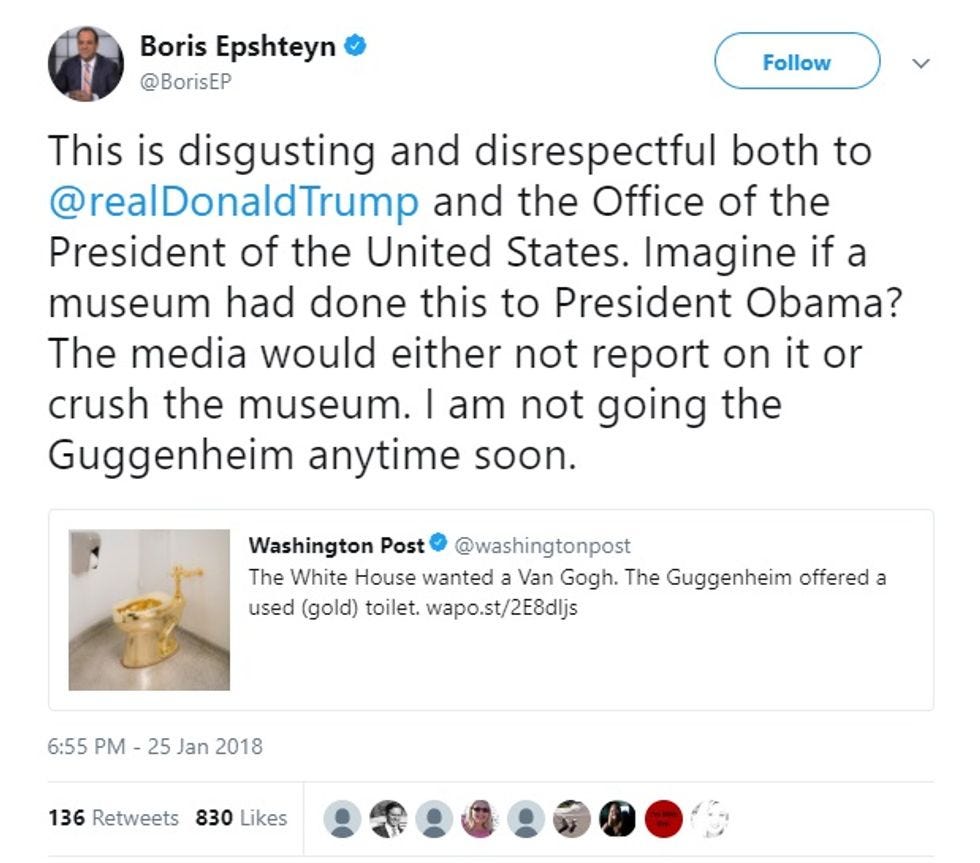 Trump supporters were, as they tend to be, outraged. Boris Epshteyn, the guy who used to have a White House comms job no one could really explain, took to the Twitters to insist no art gallery would have dared insult Barack Obama so: