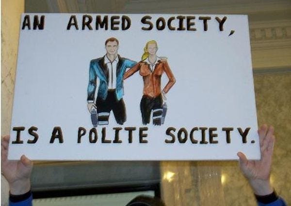 Let's check in with the absolutely vital Second Amendment, which we hear makes all our other freedoms possible. It would appear that we still need a lot more guns out there, since we're still pretty far from a polite society.