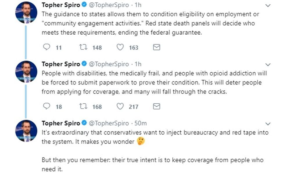 And if most people currently getting Medicaid are already working, or seem to have a good reason not to be working (which may win them an exemption from the work requirement), then why the hell is a work requirement needed in the first goddamn place? That's simple: You gotta tighten the screws on poor people, because no matter what the reality is, Republicans just know life in poverty is an endless funtimes parade of free stuff. The goal here is to add more barriers to people living the high life on Medicaid, and the result will be fewer people getting the medical care that really can improve their job prospects. Topher Spiro, of the Center for American Progress, sums up the rationale in this excellent Twitter thread: