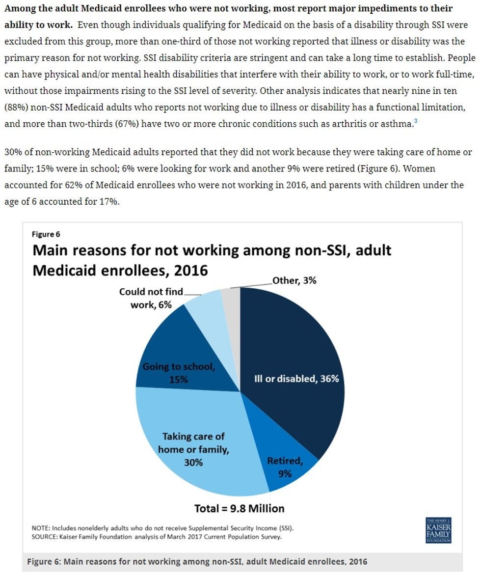 The "you gotta work" argument is especially evil because most people receiving Medicaid are already working, according to a December 2017 study by the Kaiser Family Foundation. 60 percent of adults receiving Medicaid work, and nearly 80 percent are in a family where at least one person is working. Workers on Medicaid tend -- obviously -- to be employed in low-wage jobs in which they still make so little that they still qualify for assistance, even if they work full-time. Their employers almost never offer work-based health insurance, because isn't that what Medicaid's for? And, not surprisingly, the rate of working adults on Medicaid is much higher in the South, home of "right to work" laws, hooray.