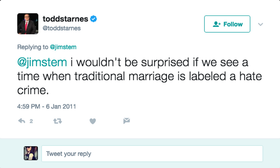 Here, by the way, is a thing Todd Starnes once said about gay marriage: