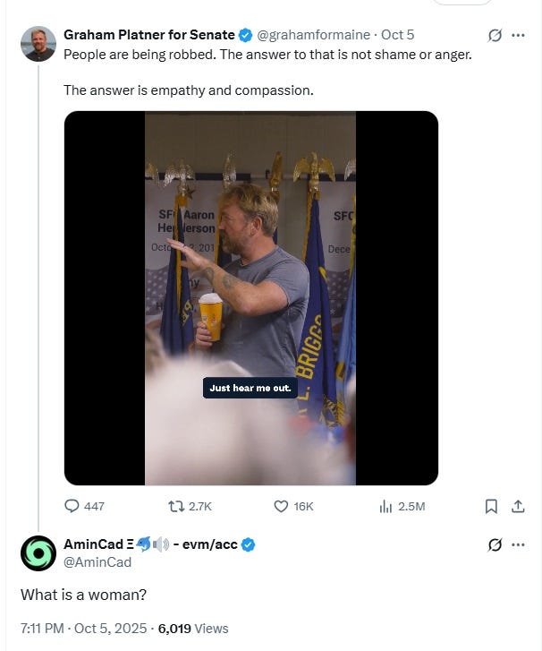 We like Graham Platner, the hunky oyster farmer who hopes to win the Democratic nomination for Senate in Maine and send Susan Collins into retirement so she can be very concerned on her own time, without still voting for fascism. Over the weekend, a video of Platner speaking at a town hall in northern Maine went viral, after he responded to a bigot who was spouting a very familiar lie about undocumented people somehow getting all the “free benefits,” which of course they aren’t, because virtually all federal social programs are limited to citizens, and in some cases to noncitizens here legally.