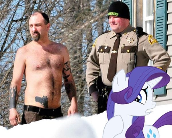 So, back in March, the nice shirtless gentleman you see here, one Michael Smith, 41, of Norridgewock, Maine, made the "weird news" features when a tree-removal crew called police because they were frightened of the strange man yelling at them with a "gun" tucked into his waistband -- and as you can see, the gun turned out to be a semi-realistic tattoo. Once the misunderstanding was cleared up (and the photos taken of course), there were laughs all around and no charges were filed.