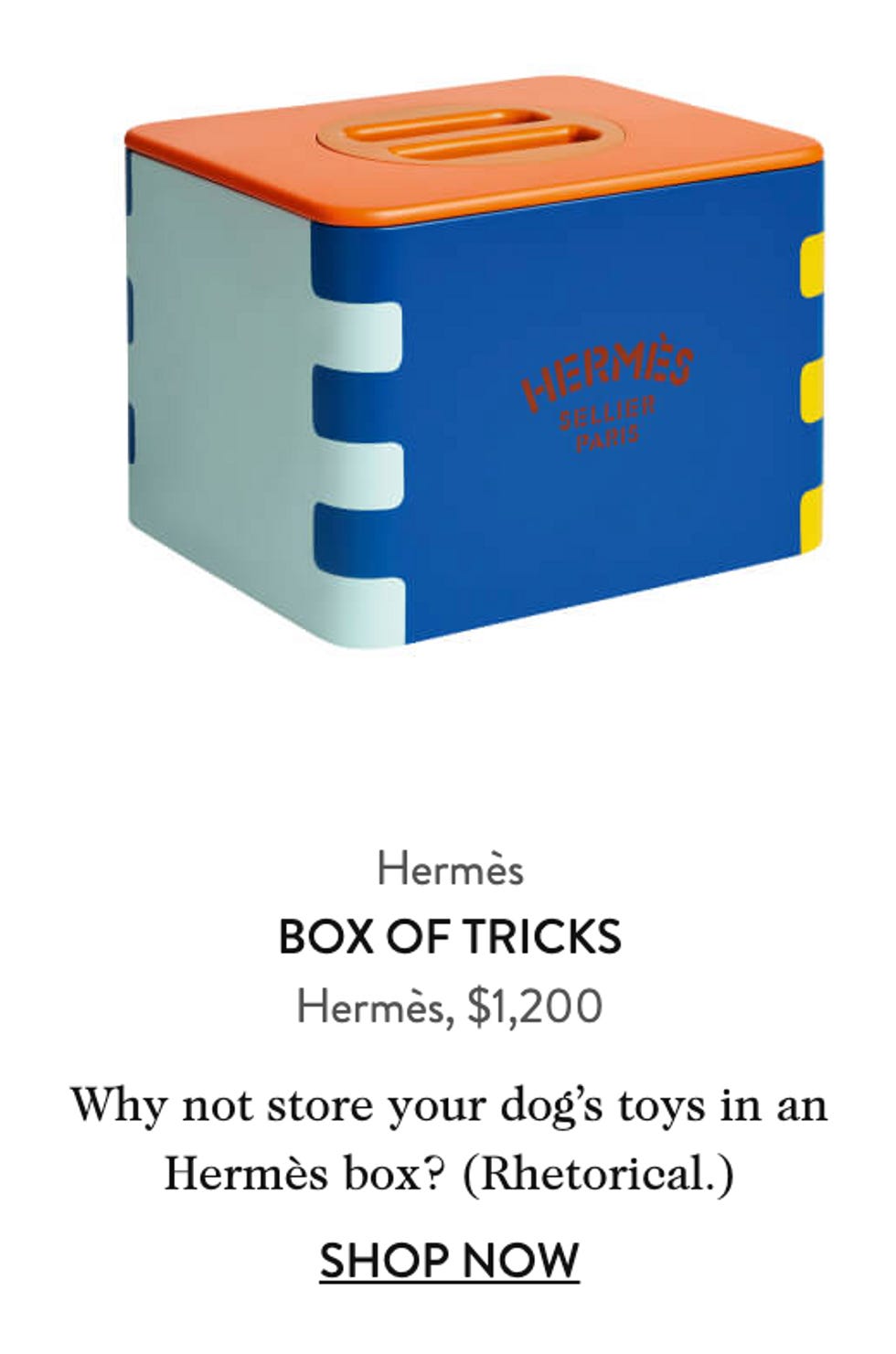This is a box to put your dog's toys in, but it's $1200 because it's from Hermés.