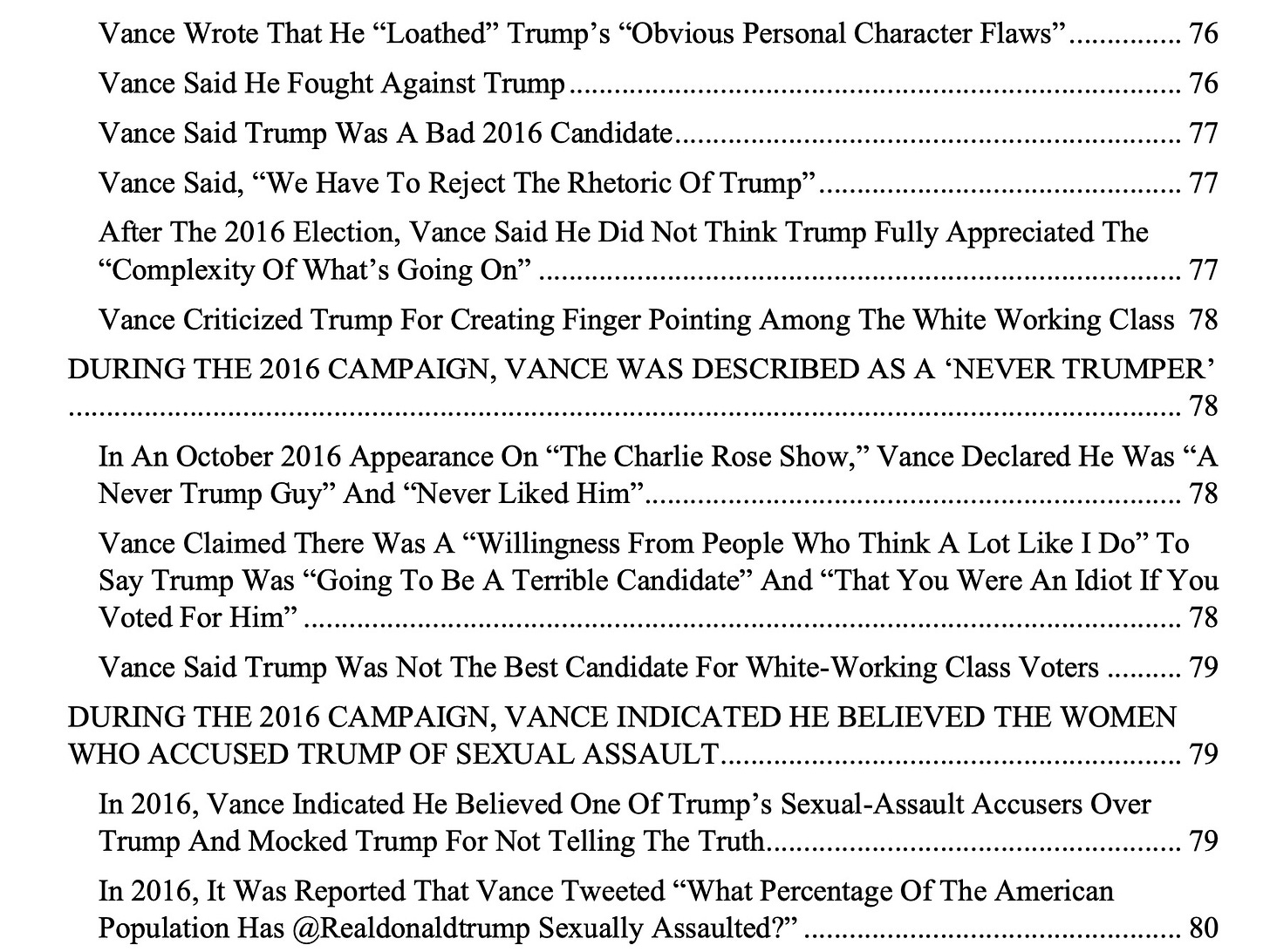 Once upon a time, Vance saw right through him, just like the rest of us do. You already knew he was a never-Trump guy who never liked him, and he used to have never-Trump friends, but there’s page after page about what a scumbag he thinks the guy is. The table of contents gives you a pretty good idea, LOL.