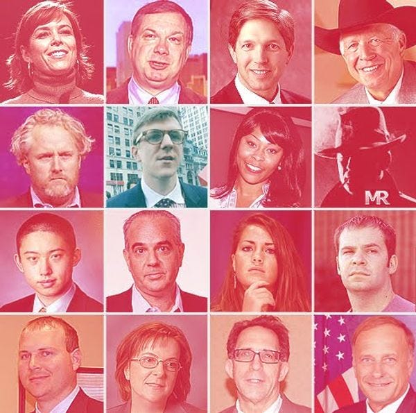 By midday the email had reached Heather Higgins (top row, turtleneck) a libertarian pundit that Bill Maher has a gross crush on. She then forwarded it along to a genuine Wyoming multi-millionaire and Koch brothers’ buddy Foster Friess (top row, cowboy hat), who then appears to have sent it to his whiz-kid male progeniture, Steve Friess (top row, third square).