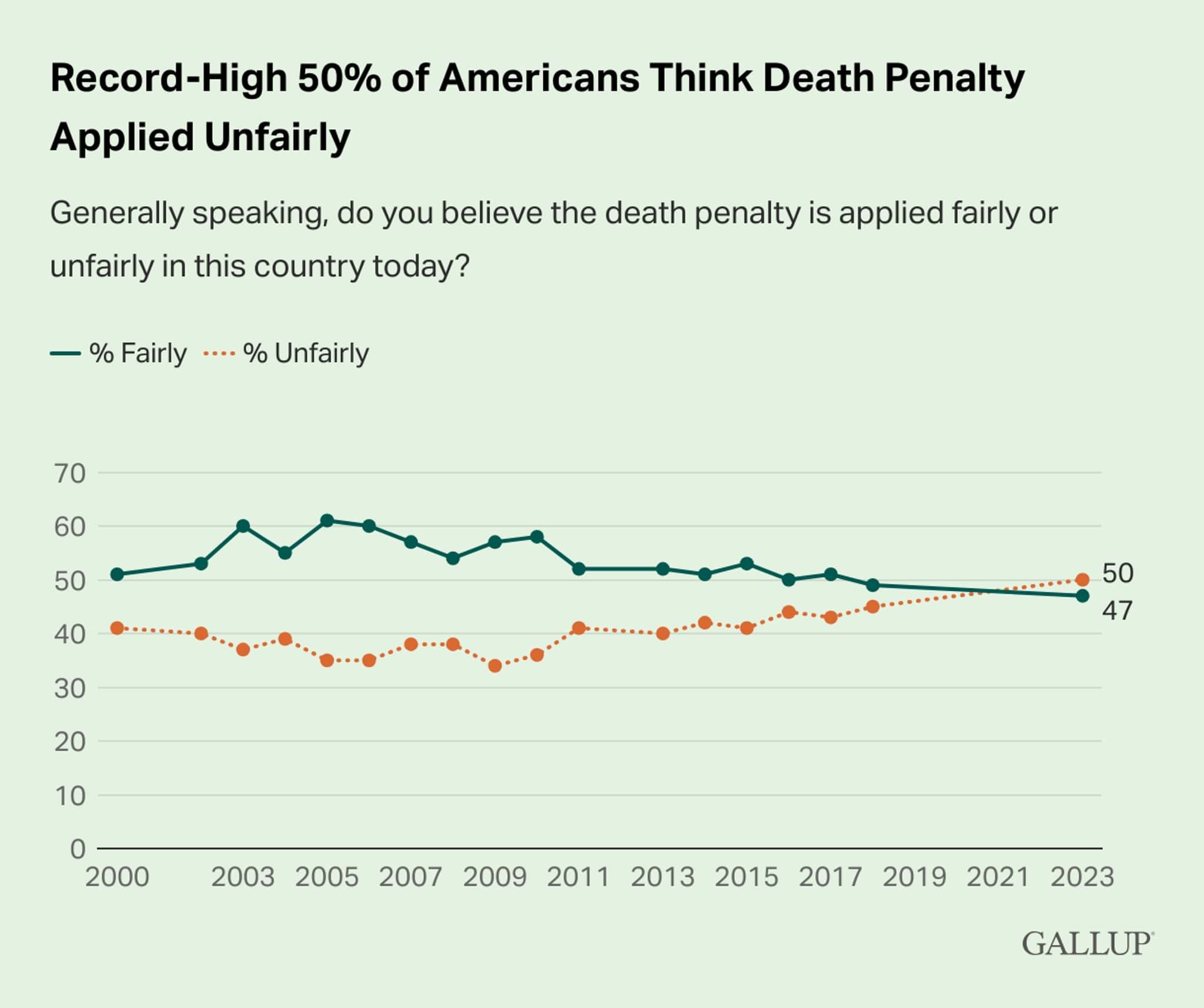 For the first time, the percent of Americans who think (well, know) that the death penalty is unfairly applied (50 percent) — is higher than those who think it is fairly applied (47 percent). Now, who knows what’s up with that three percent, but at least we’re heading in the right direction.