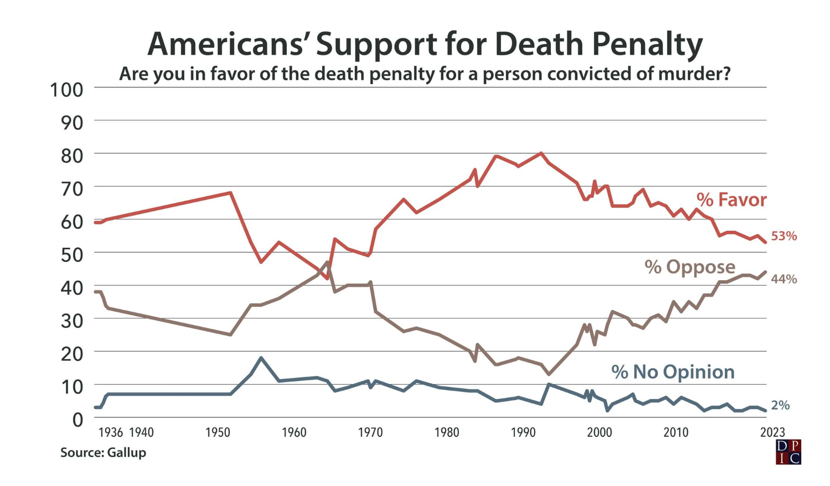 The report also found that support for the death penalty, in general, has continued to decrease. A majority still support it, but that majority is now only 53 percent, which is definitely better than the 80 percent it was in 1990.