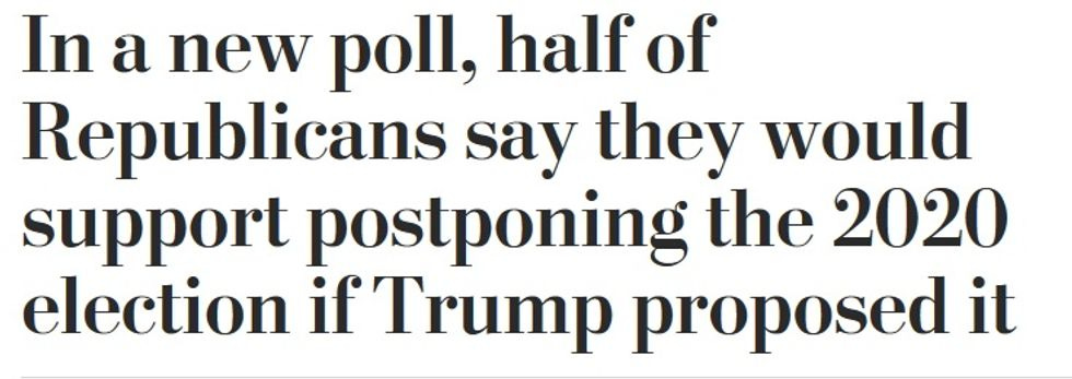 WaPo cautions that this is of course only a survey about a hypothetical, and that if Trump actually proposed such a thing, there would almost certainly be "a torrent of opposition, which would most likely include prominent Republicans," plus probably a financial panic as markets reacted to such an insane proposition. Also, while WaPo doesn't mention this, we'd bet those questions about 2016 and illegal voting no doubt primed some respondents to be more open to saying they'd delay an election for such a noble cause.