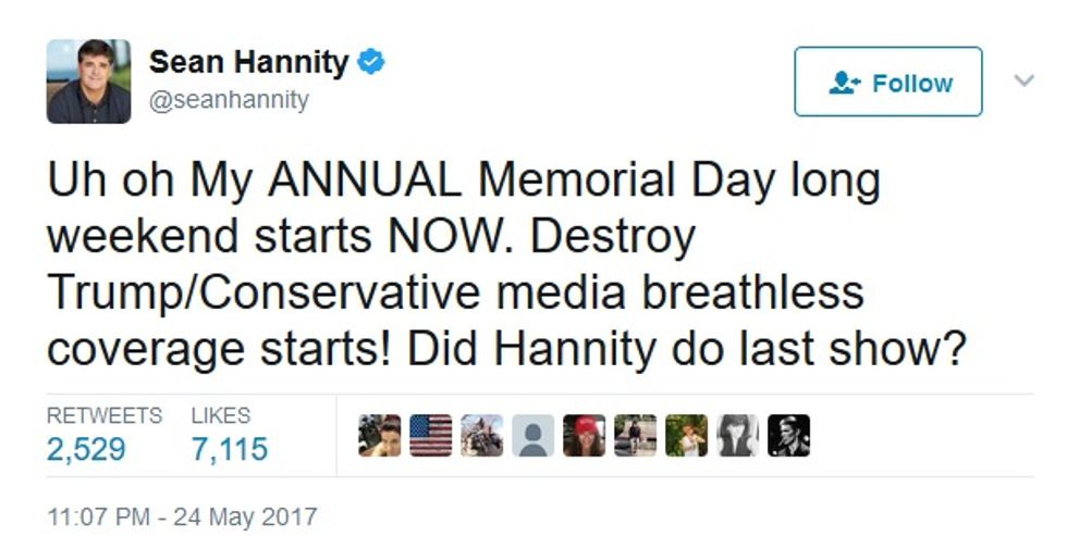 Like the rest of the country, Sean Hannity is taking a vacation for Memorial Day weekend and will be back on Tuesday [...] Those who suggest otherwise are going to look foolish.
