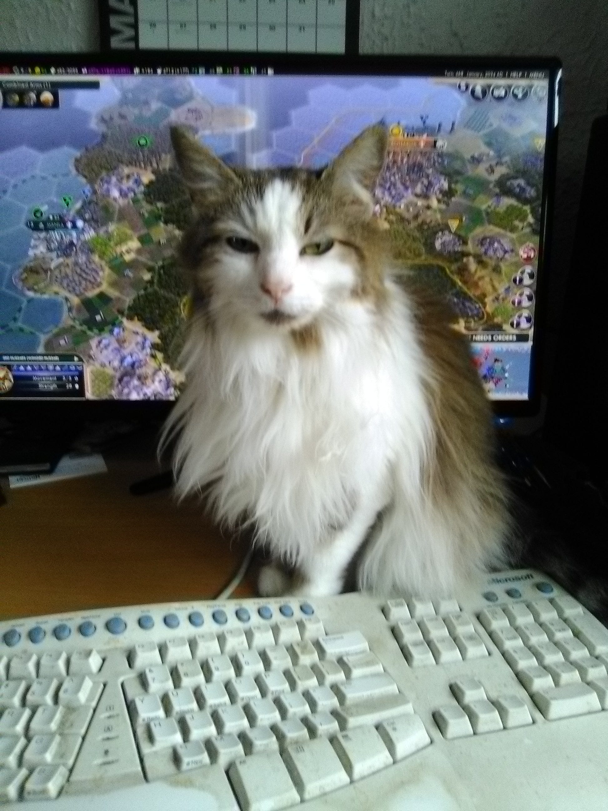 THAT is the late Her Serene Highness Princess Mocha, INSISTING on getting in front of my Civ 5 game looking for attention, or kibble, or something.