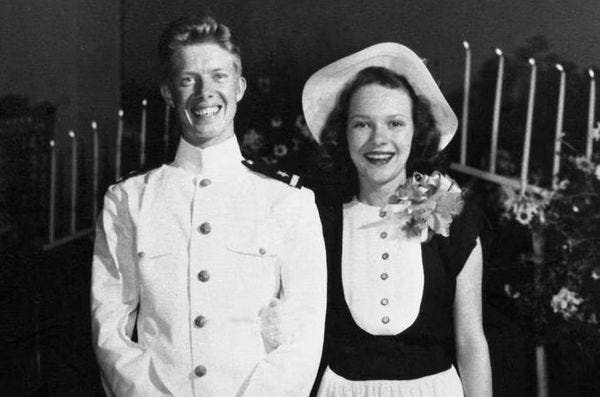 Seventy-seven years ago today, a 21-year-old graduate of the US Naval Academy, Jimmy Carter, married 18-year old Eleanor Rosalynn Smith. Both were graduates of Plains High School in Georgia — she'd been the salutatorian of her class — but didn't know each other in school; they were introduced by a mutual friend while Jimmy was attending the academy. He'd later go on to be a nuclear engineer in the Navy's submarine program, something people would bring up when, in a later job from 1977 to 1981, he'd mention "nukeyar disarmament" talks. (Not nucular , that was Bush II. Jimmy's just Southern.)