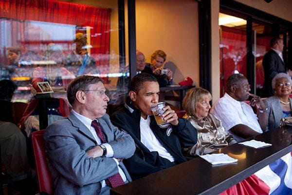 After eight years of that alky teetotaler George W. Bush, it's always a delight to see that your president is man enough to have a beer without turning into some raging drunken elder-abusing asshole. Here is Barack Obama just cold slurpin' a cold one with his powerful baseball-fan friends. On the left, let's see, that's probably Bill Gates. Hi Bill! And on the right ... hmm, maybe Madonna? Let's say Madonna. [ White House Flickr ]