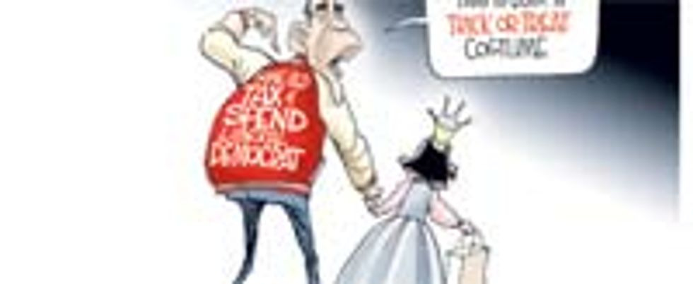 Uh, where were we ... oh, right, Halloween! I think this is supposed to Barack Obama taking one of his adorable daughters out trick-or-treating while claiming not to be a tax and spend liberal, but the fact that he's wearing a letterman's jacket was confusing, leading me to initially think he was supposed to be some high school student with a middle school girlfriend or something. He's wearing a jacket because ... that's the kind of jacket people wear with writing on them, I guess? It's not exactly a costume per se, is it? Why not a gorilla suit with the text printed on the back? Everyone loves gorillas!