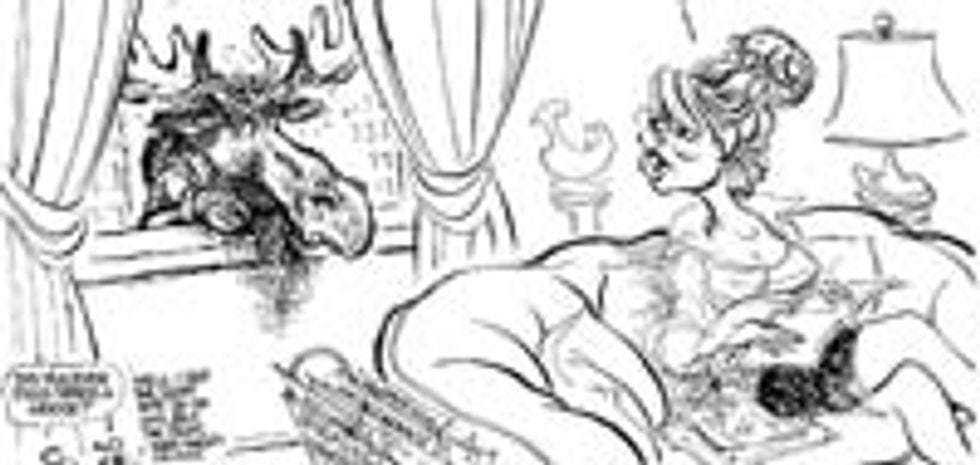 But these terrible awkward post-bestiality moments are not the monopoly of the left! No, it seems that one Sarah Palin has a certain regret in her past, possibly involving this sad-eyed moose, who can only stare disconsolately through the window at her, silently, as she trashes all the beautiful memories they had together. I know it can be hard to give up on a lost love, moose-man! But unlike the lame liberal in the last cartoon, Sarah Palin is not afraid to shoot and kill you, so maybe you had best nurse your broken heart elsewhere.