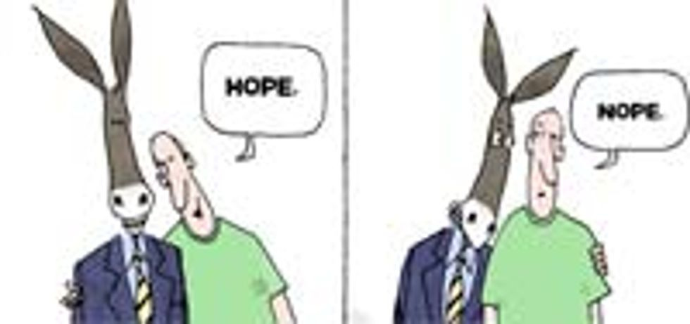 Awww, who can forget the sexy year 2008! That's when America finally got over its silly hangups and said, "You know what? I've been telling myself for years that my sexual attraction for that donkey-man in the nice suit is a sin against man and God. But this is the 21st century! I can't let outdated dogma that tells me that man/donkey-man love is wrong hold me back! I'm going to go over there and 'vote for Obama' (i.e., proposition him). I 'hope' it will be as erotic as I always dreamed!" Sadly, in 2010, we find that the sex thrill is long gone, and now America reacts with queasy distaste when the sexy donkey man comes back for another go.