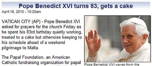 What did the evil Emperor of Rape Joseph Ratzinger get for his birthday? An eternity roasting in Hell, plus a cake! We figured we ought get him something, too.