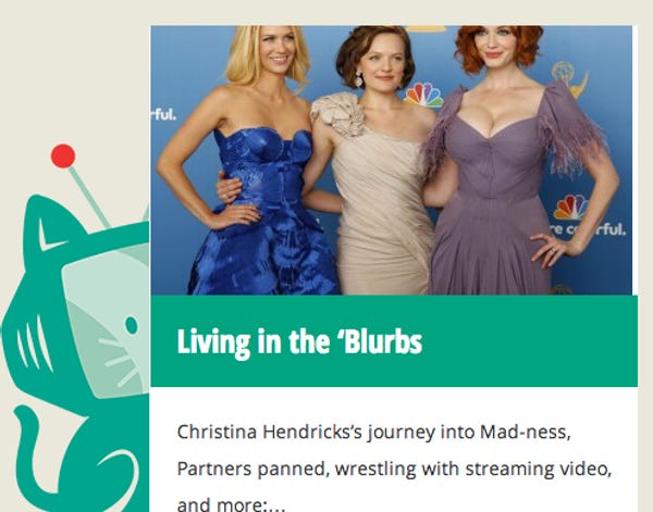 HE'S MADE IT ABOUT TELEVISION! And put up pictures of Christina Hendricks's boobs! We love television! You love Christina Hendricks's boobs! You probably do not love television, though, because you are cranky and you only watch PBS and The Bill Moyers Suicide Hour. We will continue to act as his publisher, so if you want to buy a post saying "WATCH THE BILL MOYERS SUICIDE HOUR," we will sell it to you and then make him write it.