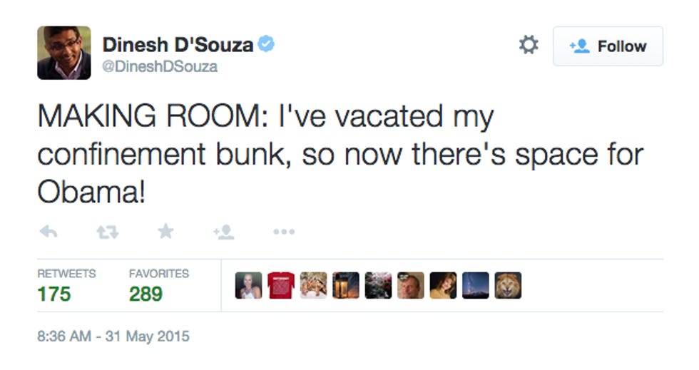 D'Souza was inspired by his anthropological study of therealcriminals by whom he was surrounded, but with whom he most certainly did not belong -- "I feel I was put into an environment that I never would normally be in," he said, which is semi-true; he wouldn't have been there if he hadn't committed that felony -- and that helped him to realize something he'd never realized before: he sure does think Democrats and liberals suck. Oh wait, that's been his pitch all along, but it's different now, because of how prison changes a man. And in D'Souza's case, it seems to have changed him into the kind of man who is even more despicable than he was before, which we didn't know was possible.