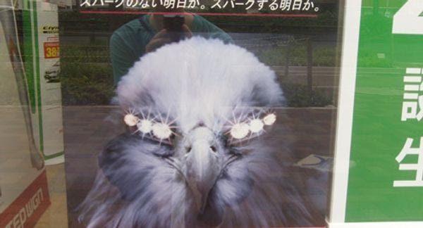 Wonkette operative "Dewey" sends this important photograph from the communist stronghold of "Nagoya, Japan," where insurgents have apparently stolen America's Secret Weapon For Freedom, the Eagle with frickin' lasers for eyes. Will North Korea get hold of this crucial defense system? Why did we give it to Japan, anyway? Oh, it's actually an advertisement for cars? Never mind, then. (We mean: NEVER FORGET.)