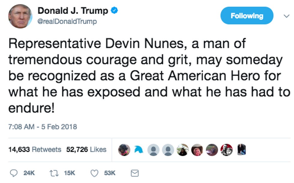 Yeah you bet. Great American Hero Devin Nunes. Move the fuck over, Paul Revere, Devin Nunes is horseback riding around the White House lawn in circles, loudly hollering to everybody who will listen, "MORE MEMOS ARE CUMMING! MORE MEMOS ARE CUMMING!"