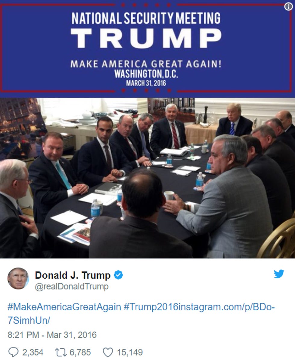 Mercy me, Devin Nunes is a fucking idiot. The congressman from MENSA told a really dumb lie on "Fox & Friends" this morning, which is that Donald Trump, pictured below, has never even met Trump campaign coffee boy/Russian intelligence cut-out George Papadapoulos, pictured below in the same picture. Why yes, that was the famous Trump foreign policy team meeting, where Papadopoulos bragged about how he could set up a Grindr date for Trump and Vladimir Putin.