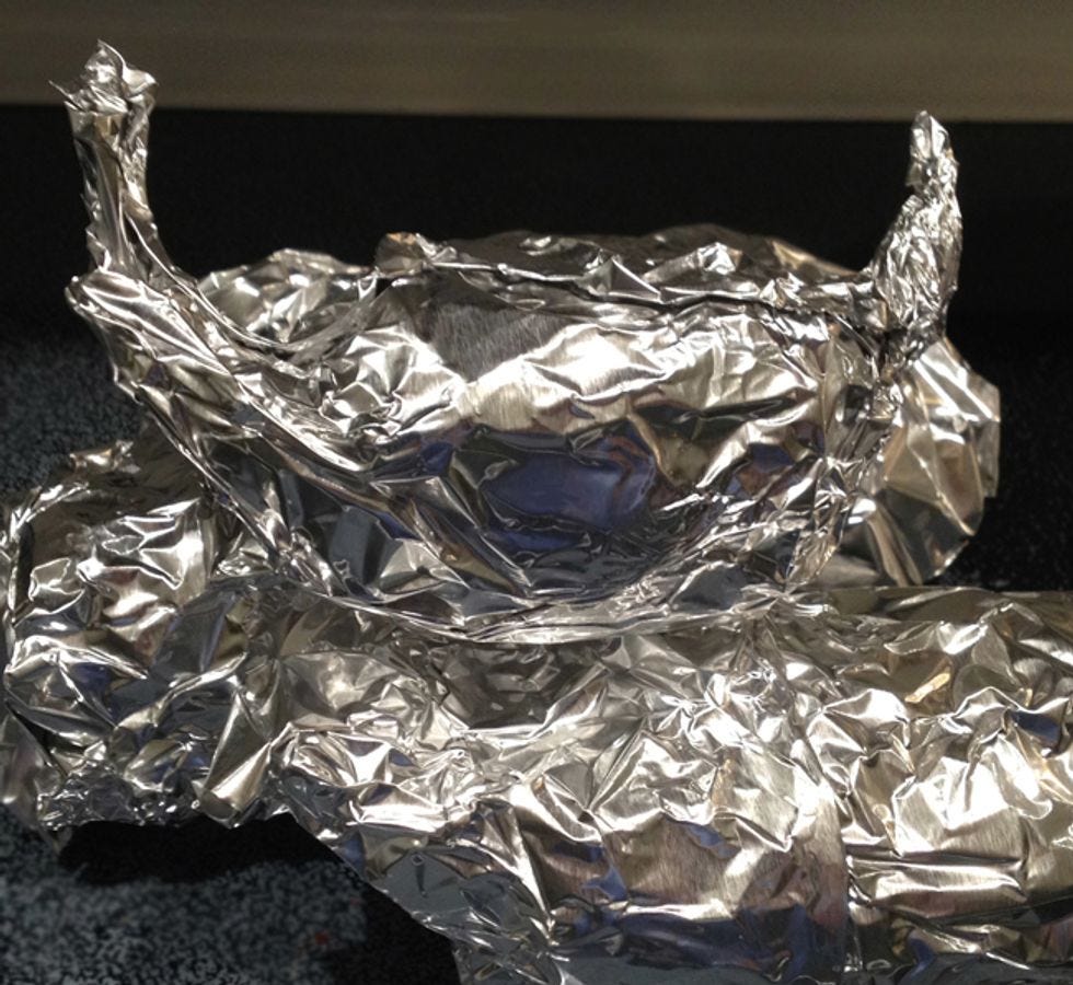 I like to roll potatoes in a little oil and kosher salt after I pierce the skin and before I wrap them in foil. Find the potato leader in your collection and give it foil horns. Bake at 425º for about an hour and fifteen minutes.