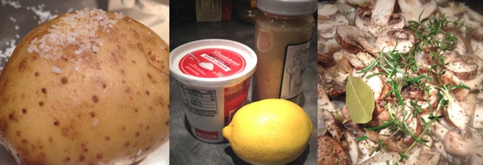 Slice baked potatoes (about) halfway through, lengthwise. Pinch both ends to open the crease (careful, it’s hot), and lay on some healthy spoonfuls of creamy horseradish sauce. Stuff with sautéed mushrooms. Finish the top with a small dollop of sauce and have dinner.