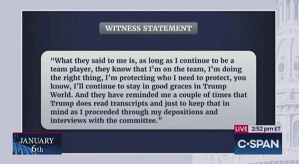 "I hardly know who this person, Cassidy Hutchinson, is, other than I heard very negative things about her." That's the response from Donald Trump to this testimony from Hutchinson. This is strange, because as Liz Cheney demonstrated during the hearing, she was so close to the action she probably can differentiate between Trump's "needs to poop" and "just pooped" and "pooping right now" waddles. Cheney showed pictures of Hutchinson with congressmen like Jim Jordan and Matt Gaetz and Steve Scalise and Kevin McCarthy, and then showed pictures with Meadows and other White House folks. You could see into the Oval Office from her office.