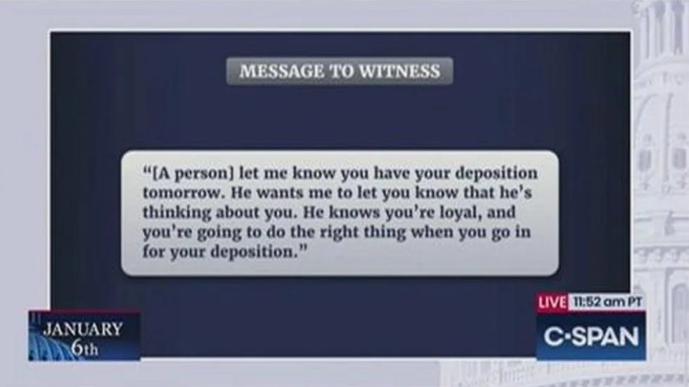In summary and in conclusion, Liz Cheney finished the hearing by teasing messages somebody/ies have been getting from somebody/ies just reassuring them before they meet with the committee that Daddy loves you and Daddy knows you love him and Daddy gently reminds you that if you tell the truth about Daddy to the Unselect Committee he will put a horse head in your bed and probably also some horse testicles in your lunchbox.