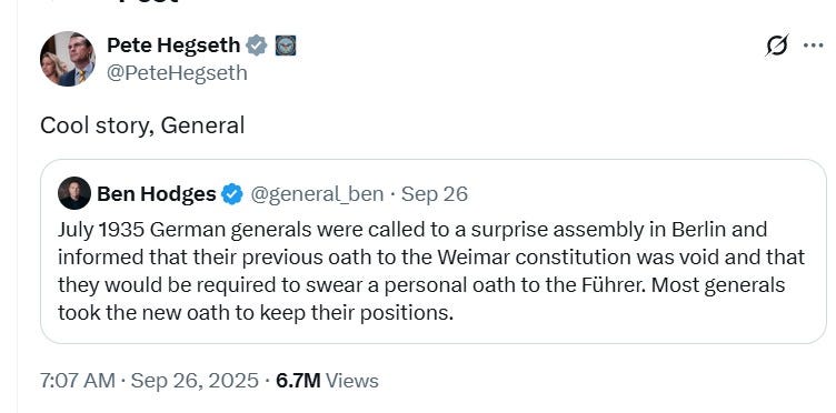 There has been some speculation online from academics and others that Hegseth is bringing all the officers to see him for some incredibly dystopic reason. Maybe he wants to demand they all swear a loyalty oath to him, or to the president, and he’ll purge anyone who refuses.