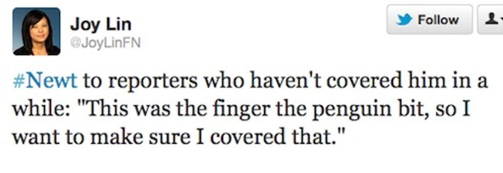 8: 50 -- Poor L. Newt. Cooper ditched him about the time we tried for the the third time to parse a sentence about China, and Fox didn't cover him speaking at all. But they ELECTION ALERT for that nice Ann Romney, whose hair looks just the right Diane Sawyer shade of golden bitch.