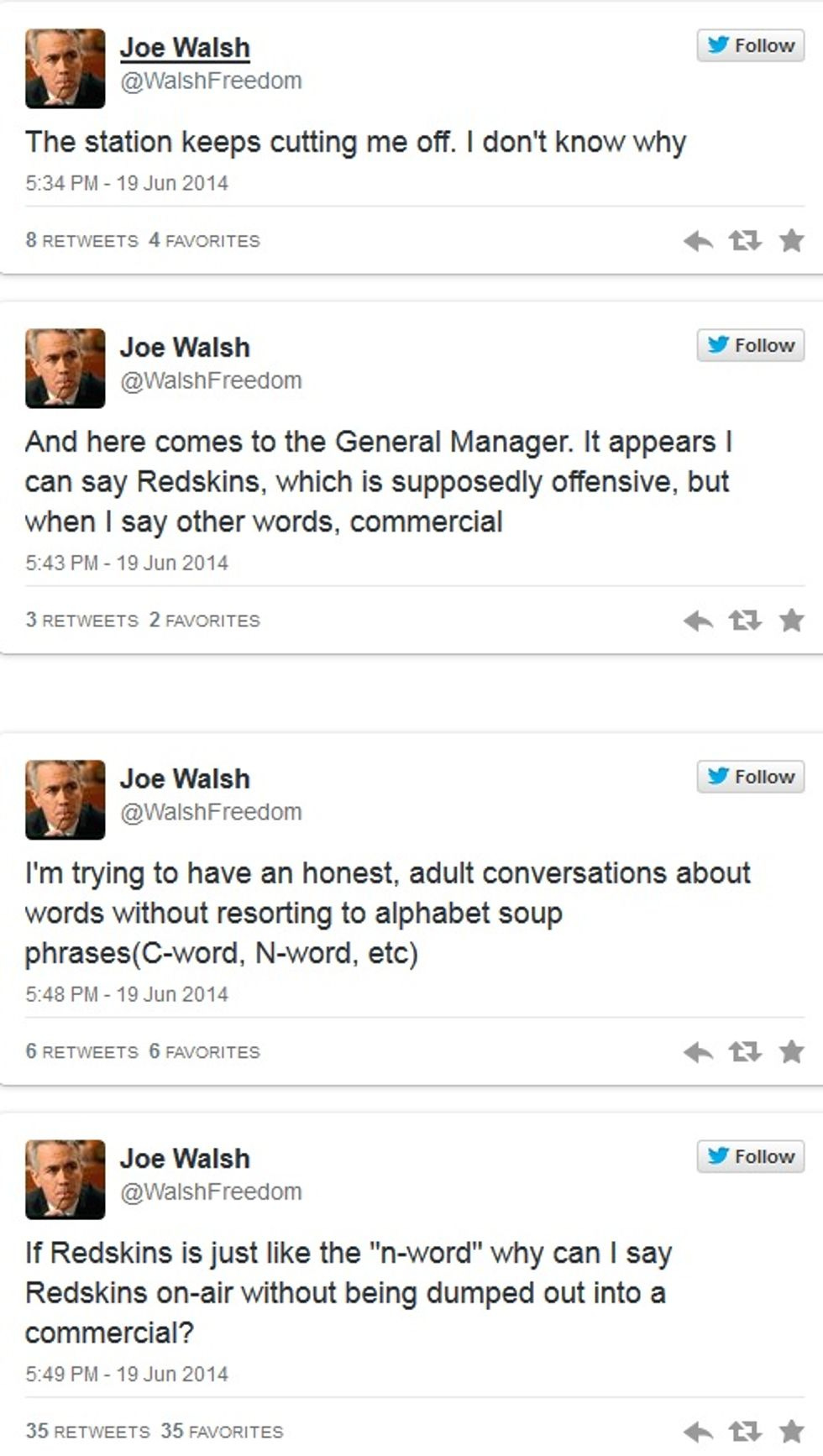 Former Illinois congresscritter and forever deadbeat dad Joe Walsh was sent home early from his job as a wingnut talk radio host Thursday, because obviously the management of the radio station has no idea how Free Speach * works. See, all he was doing was making a commentary about the controversy over the Washington Redskins' team name, and to make his point it was very important to him that he actually say other offensive terms on the air, for demonstration purposes. For some reason, his socialist employers at Chicago station WIND-AM didn't understand the simple logic of this, and yanked him off the air.