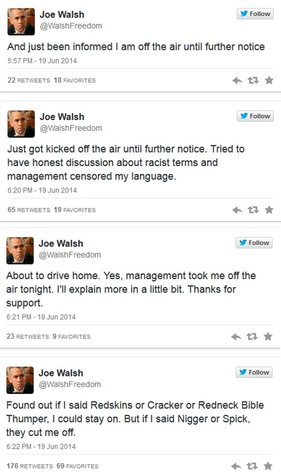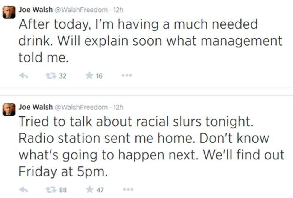 We'd just like to take a moment to salute Joe Walsh, censorship victim, for his brave willingness to demonstrate the hypocrisy of political correctness -- after all, doesn't everyone know that all possible insults are exactly equal in their offensiveness, and that "Bible Thumper" and "Nigger" are completely the same, because they're both disparaging? It is truly a sad day for the 1st Amendment. We'll let you know whether Mr. Walsh is ever released from the gulag.