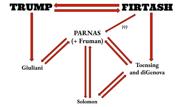 These awesome hustlers paid Rudy $500,000 last summer for, ahem, "security advice," hence Rudy's claim that his communications with them are privileged. But their friendship seems to have really taken off when Parnas offered his services as a fixer for Giuliani's "investigations" in Ukraine. You'll note that the arrow in the graphic above goes both ways, as do the claims of "privilege" for their communications.