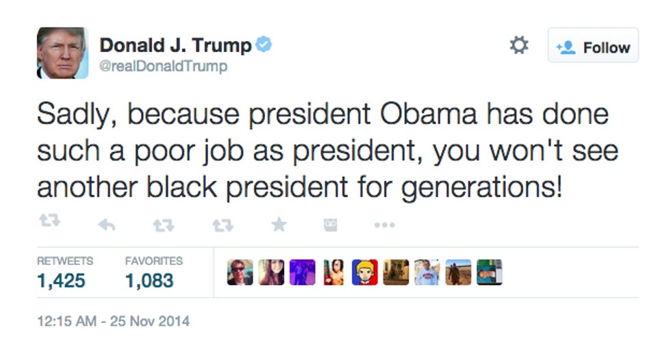 1. Remember how Trump took to Twitter while we were all waiting for the Ferguson non-indictment, and helpfully explained that Barack Obama has ruined black presidents forever, by being so bad at presidenting?