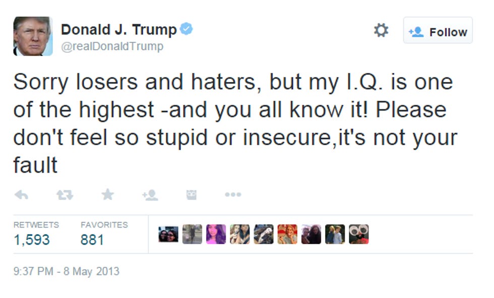 6. Guess what's NOT the stupidest? Donald Trump's IQ is not the stupidest, it is the S-M-R-T-E-S-T, and if you see it at the urinal you shouldn't feel bad because it is so YOOOOOOOOOGE and yours looks like a little button: