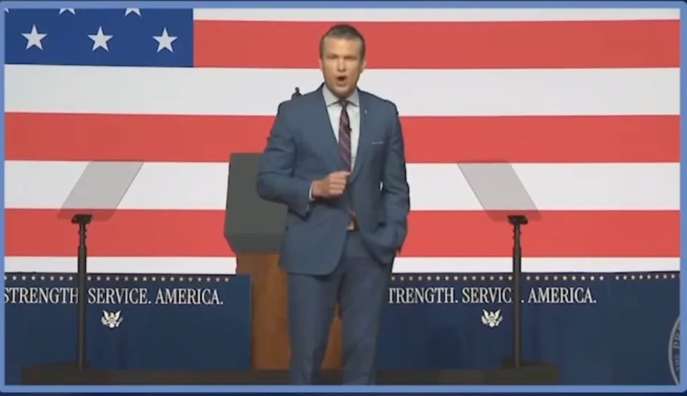 We are of course talking about that prissy hysterical loser moment when Hegseth pulled his camouflage Pull-Ups all the way up around his nipples, struck his most threatening pose, affected the greatest swagger he could affect — and we know about his swagger, because we saw him trying to do the griddy the other night LOLOL what a fucking loser — and he looked at the camera and he issued this warning to any American adversaries who might think of messing with the American department of WAR!