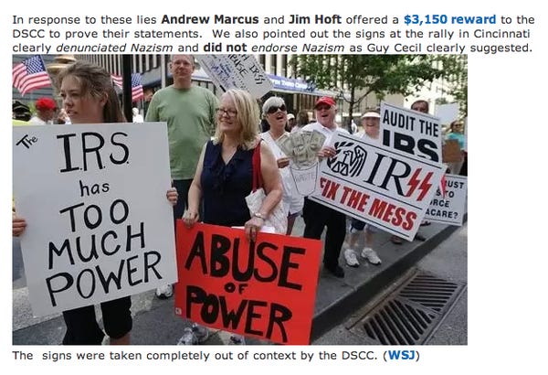 When some guy, Guy, sent out a DCCC DSCC fundraising letter, he said that Tea Party people “waved signs with Nazi symbols.” You said — in bold even! — that Of course, this did not happen. Anywhere.You promised $3150 to the feminist group of Elizabeth Warren's choice if anyone could prove that it did. (Dear Senator Warren: we are a feminist group. Please have Hoft send the lovely munnies to us.)
