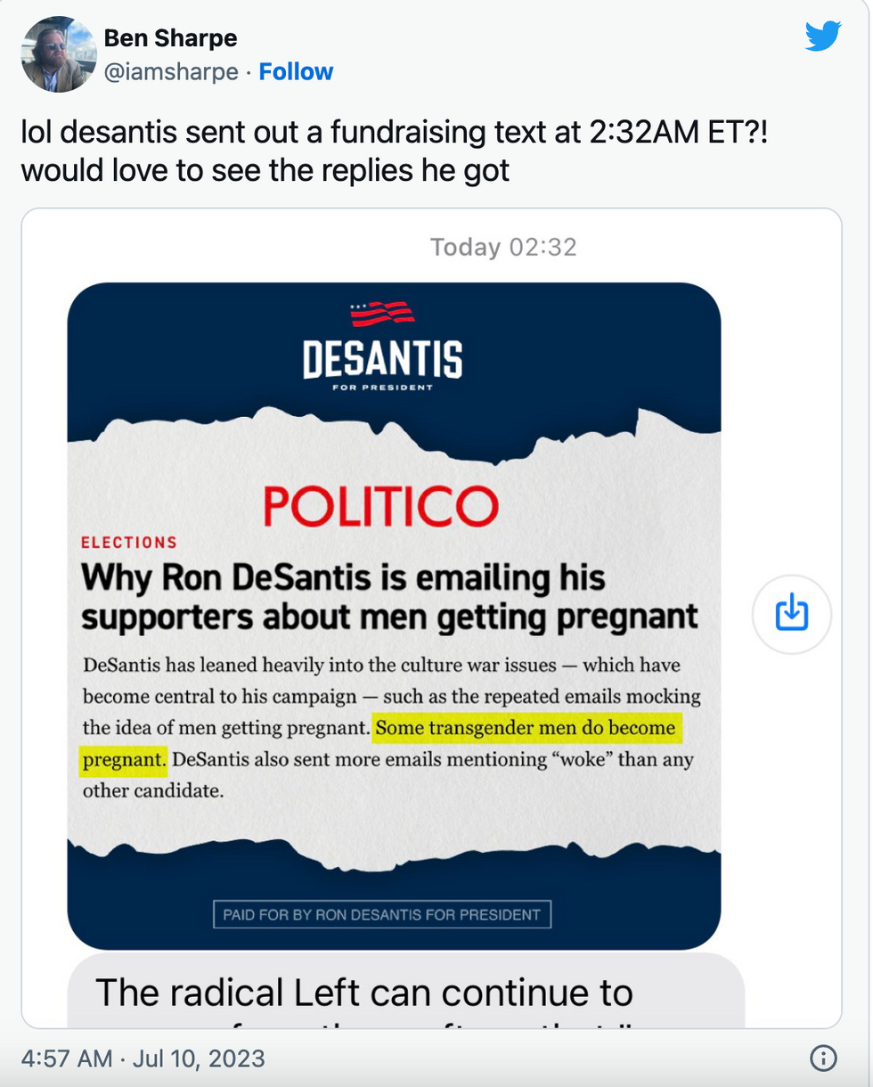 The wannabe Napoleon (but without the charm) sent out a desperate fundraising text at 2: 30 a.m. Monday. He wouldn't risk waking his supporters over just anything, though. No, he was wailing about "radical Left" publication Politico — yes, Politico — stating that "Some transgender men do become pregnant," which is true, but Ron DeSantis will never stop fighting facts he personally finds unpleasant.