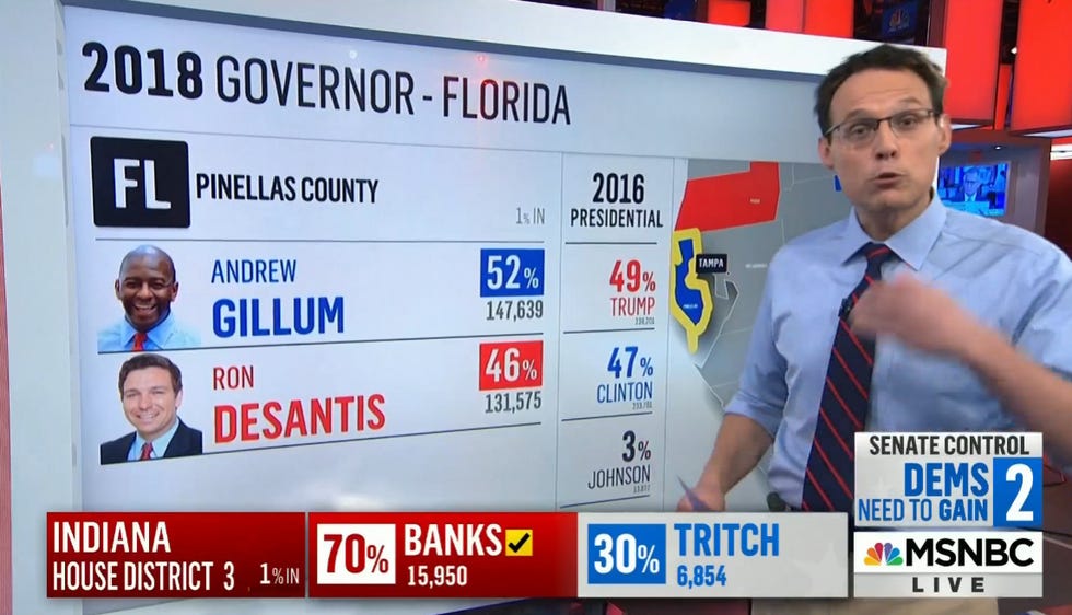 7: 29:Chuck Todd is currently Chuck Todd-ing about WHAT DOES IT MEAN if Abrams wins in Georgia and Gillum wins in Florida but Bredesen doesn't win in Tennessee? (Chuck Todd knows nothing about Tennessee politics.)
