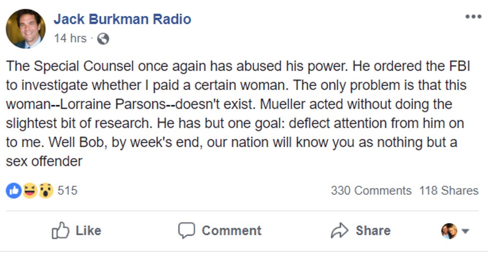 Remember, Jack Burkman has been publicly offering financial rewards for a while now to people with damaging information on Mueller and the wider Russia investigation. Also remember that when an investigative journalist named Scott Stedman talked to the Burkman intermediary that the letter from "Parsons" alleged had contacted her, that dude actually admitted he was paying women to lie about Mueller :