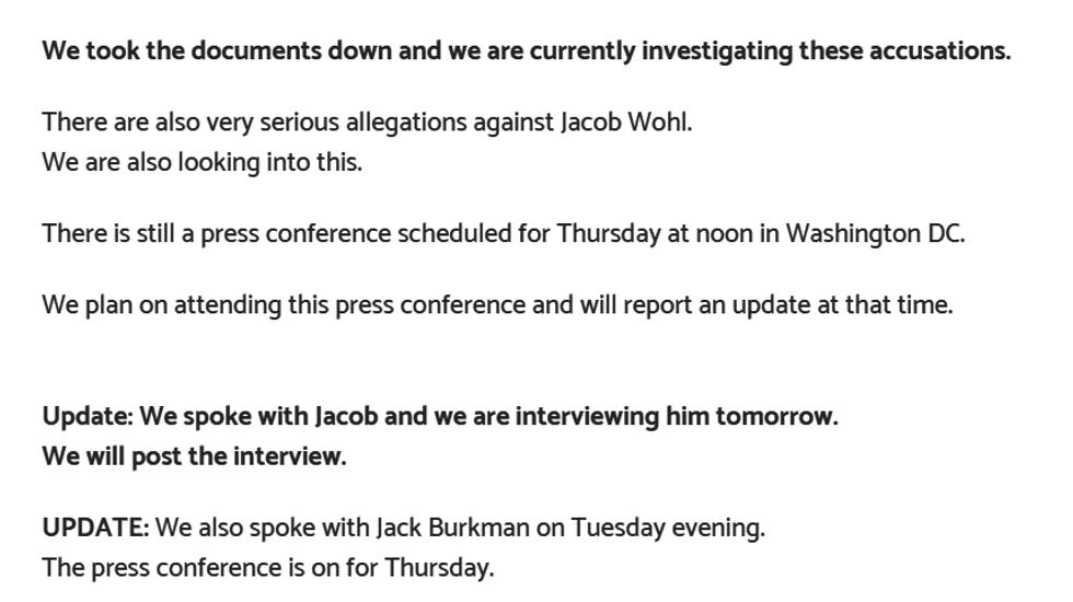 Jack Burkman and Jacob Wohl are saying the press conference will go on, because we guess the only way out of this situation is through it. Jim Hoft is apparently going to the event, and Wohl tweeted that he's on his way to DC, so that was nice of his mom to buy him a plane ticket.