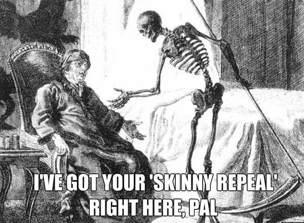 So here's the skinny on why the skinny sucks: Again, no bill, but it would definitely get rid of the individual mandate (everyone has to buy health insurance) and the employer mandate (employers with over 50 employees have to provide insurance). It would also eliminate the medical device tax. And maybe if Republicans close their eyes and wish real hard, it would defund Planned Parenthood, an idea the Senate parliamentarian has already said can't be passed without 60 votes.