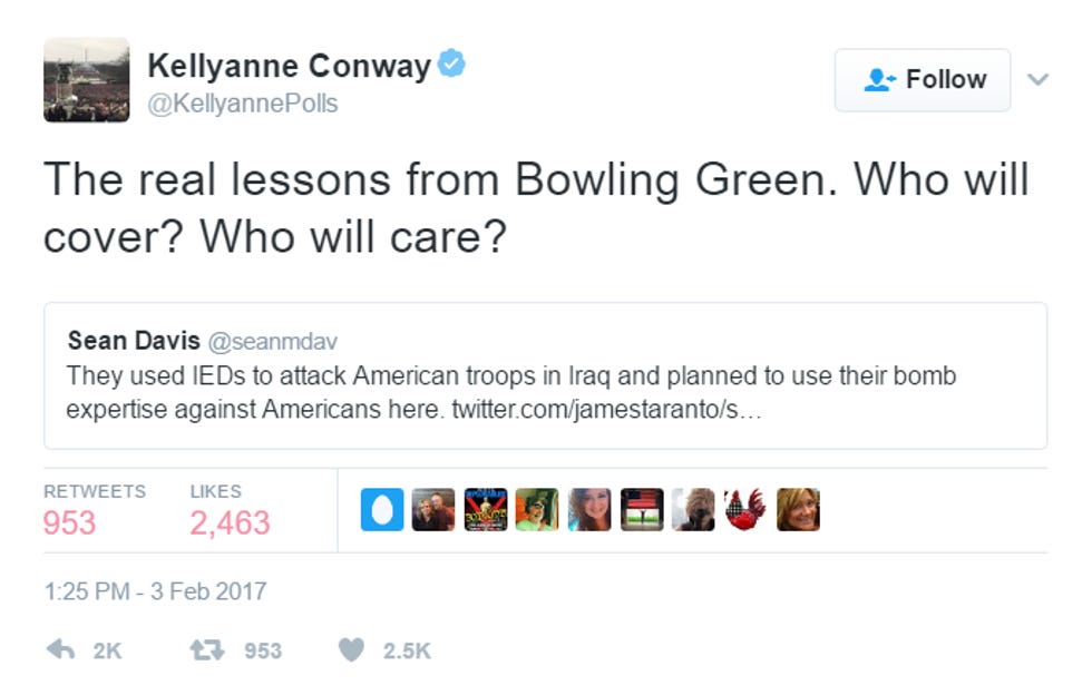 You might think Kellyanne Conway decided to take the rest of the week off after she moaned and wailed at Chris Matthews about #NeverForgetting the Bowling Green Massacre, which is a thing that happened, in Bowling Green. You only don't know about it because there was a media blackout that day, because the media HATES to cover bloody, violent things. But you underestimate the vast reserves of energy Kellyanne Conway has for being a stupid lying bullshitter who lies about stupid bullshit. Like, if Donald Trump had that much energy, he might be able to overcome his fears and hobble his rancid ass up the stairs to Kellyanne Conway's office, so she could spew some bullshit at him.