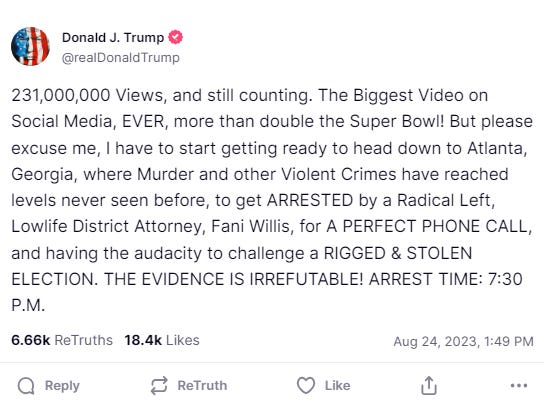 231,000,000 Views, and still counting. The Biggest Video on Social Media, EVER, more than double the Super Bowl! But please excuse me, I have to start getting ready to head down to Atlanta, Georgia, where Murder and other Violent Crimes have reached levels never seen before, to get ARRESTED by a Radical Left, Lowlife District Attorney, Fani Willis, for A PERFECT PHONE CALL, and having the audacity to challenge a RIGGED & STOLEN ELECTION. THE EVIDENCE IS IRREFUTABLE! ARREST TIME: 7:30 P.M.