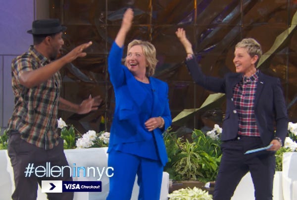 Hillary went on the Ellen DeGeneres Teevee Lesbian LOL Giggles Hour, and the full interview aired Thursday, but Ellen went ahead and released this clip of Hillz trying to learn to do the "Whip" and the "Nae Nae," which are hippy-hoppy dances yr Wonkette has heard of, due to they are sweeping the nation!