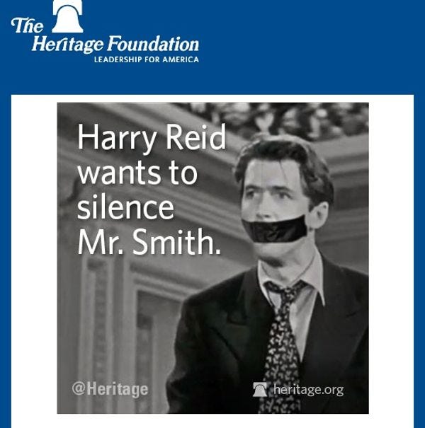 So above is the Heritage Foundation's invocation of Mr. Smith Goes to Washington, aimed at Harry Reid's proposal to change how filibusters work. We will now pause, class, for you to ponder what is wrong with this picture.
